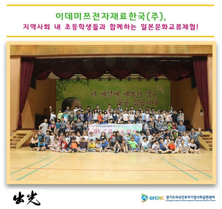 이데미쯔전자재료한국(주) 사회공헌활동 관계자는 “회사의 주재원들과 한국인 스텝이 지역 사회의 초등학생과 서로의 문화와 생각을 공유하는 시간을 가지면서 어린이들의 미래지향적인 모습을 발견해 참가자 모두가 보람을 느꼈다.”고 전했다.