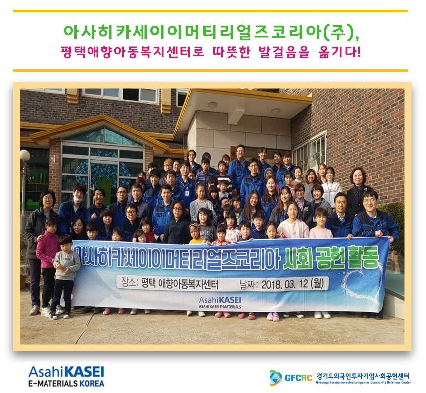아사히카세이이머티리얼즈코리아(주)(대표 이가라시 히로유키)는 사람들의 "생명"과 "삶"에 공헌한다는 ASAHIKASEI 그룹의 이념을 바탕으로 임직원들이 안심하고 근무할 수 있도록 여러 기반 시설을 제공해 준 지역사회에 사업 활동에서 얻은 성과를 환원하며 상생의 행복을 꽃피우고 있다.